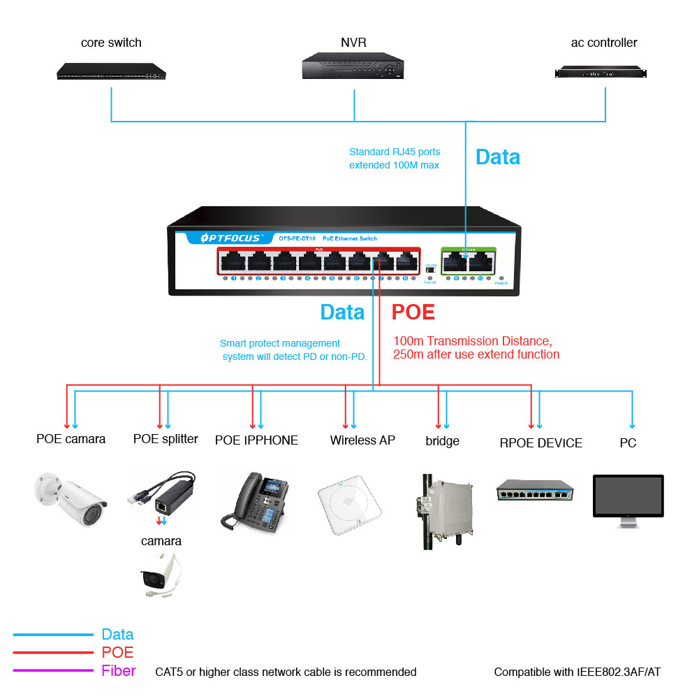 포 스위치는 IP 카메라, 무선 랜 ap, 인터넷 전화 단말, 오피스 액세스 컨트롤 시스템즈와 다른 PD 장치와 같이 포 장치를 작동시캐서 이상적이고, 다른 환경에서 이더넷 응용에게 전체 해결책을 제공하는 고품질 제품의 라인을 제공합니다.